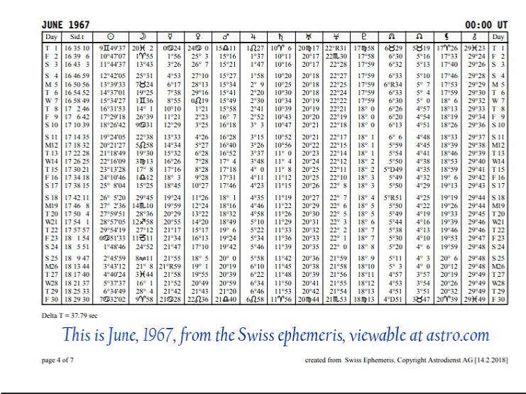 The ephemeris shows us planetary positions. We consult the ephemeris (sample page below) to see future trends or analyze past events.